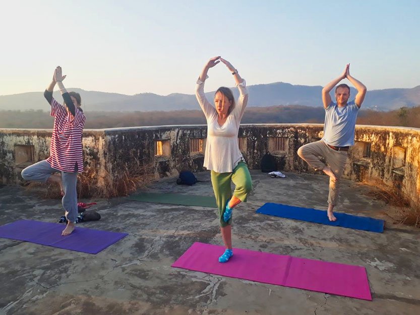 At 6 AM, we start our drive for this refreshing and relaxing Yoga and Hiking Tour of Udaipur. We make our way through the narrow village roads and reach our Hiking Trip Start Point, Badi village. The place is completely in the lap of nature and serene ambiance. Next, we hike in the forested hills straight to the summit of the mountain and experience the beautiful dawn and the gorgeous Sunrise in Udaipur Countryside. We set about a 45- minute yoga session while capturing a 360-degree view of flourishing mountains and mesmerizing Badi Lake. An expert yoga instructor introduces us with a comfortable yogic routine including some effective Asanas (yogic postures) and Pranayamas (Breathing exercises).